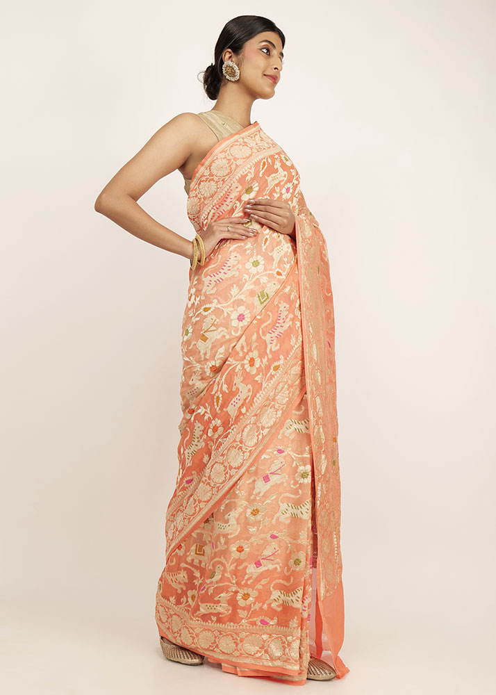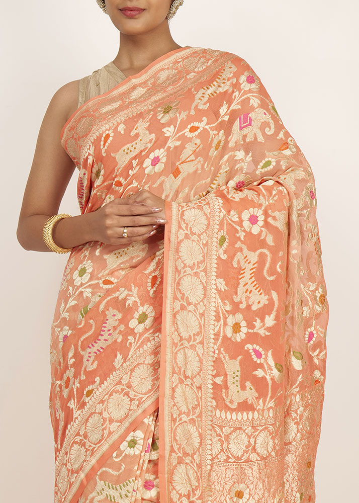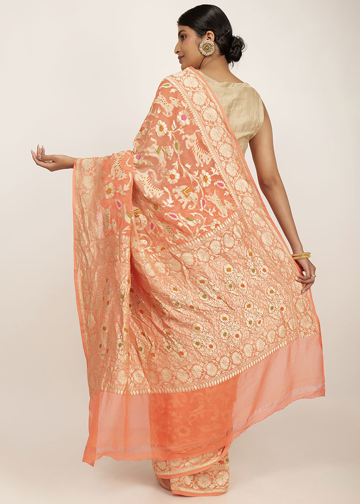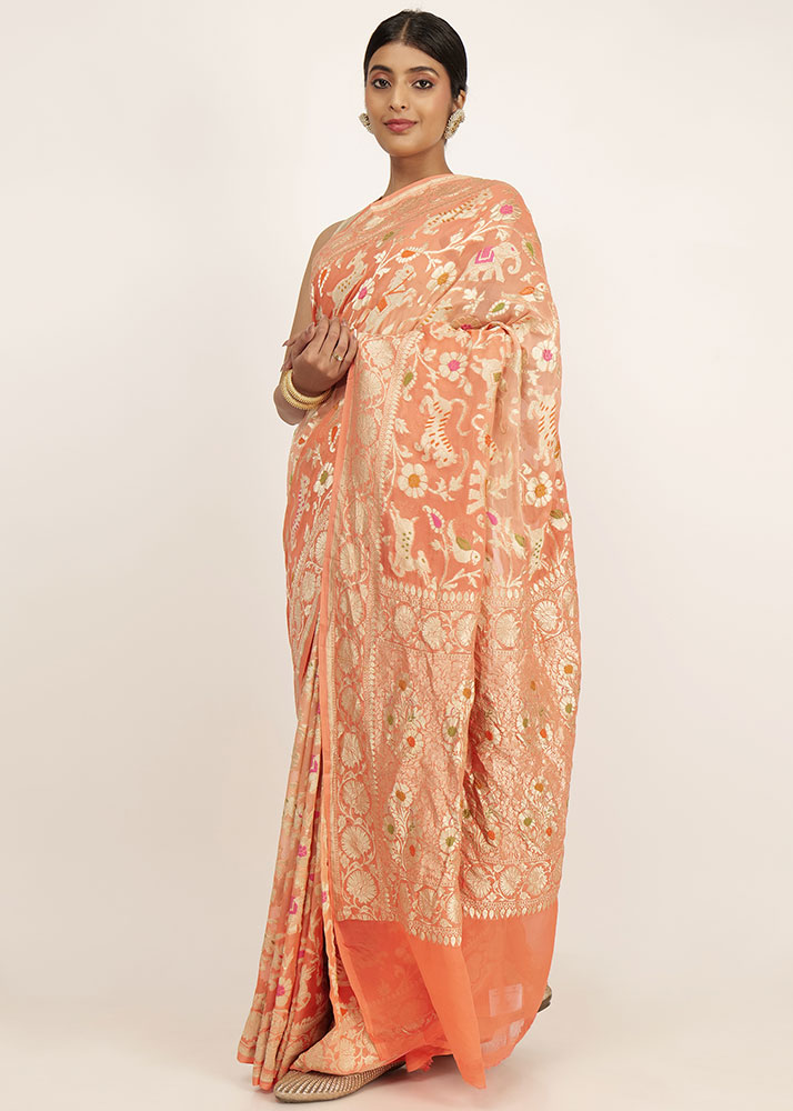 Orange banarasi saree with shikargah design handwoven in finest georgettes makes it an exquisite piece. Light yet festive.