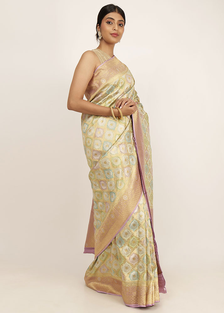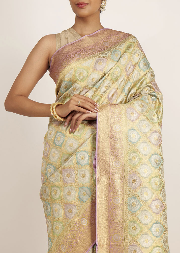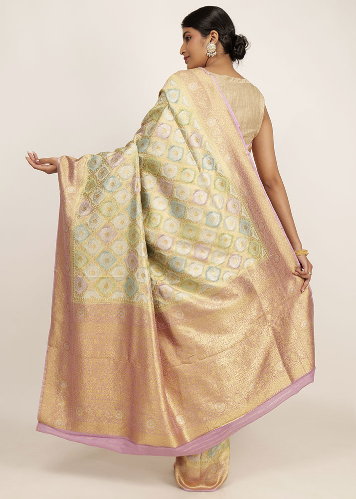 Artistically flourished, this beautiful Rangkaat pure georgette saree in pastel colours works wonders for your bridal wear. Colourful Rangkaat with pure zari on lilac pallu is an unparalleled craftsmanship.