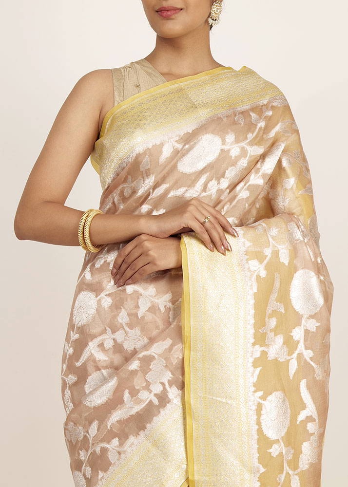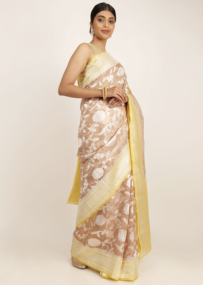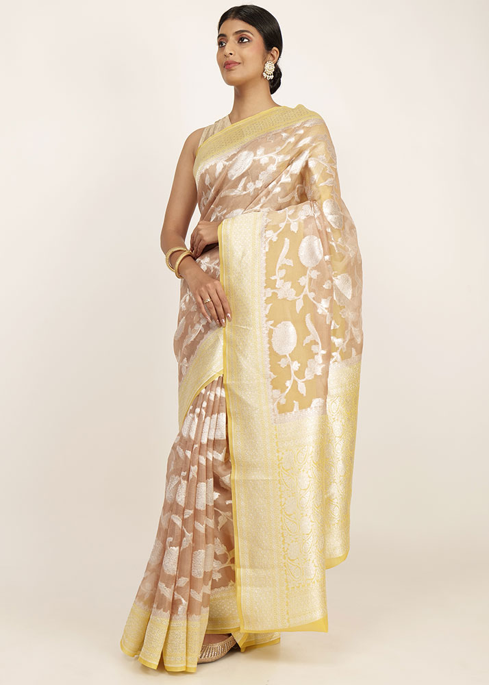 This KORA saree is intricately hand woven using zari weave process by Banaras handlooms. A light, see-through fabric made by degummed silk yarns. This fabric is lightweight, fluffy and crisp.