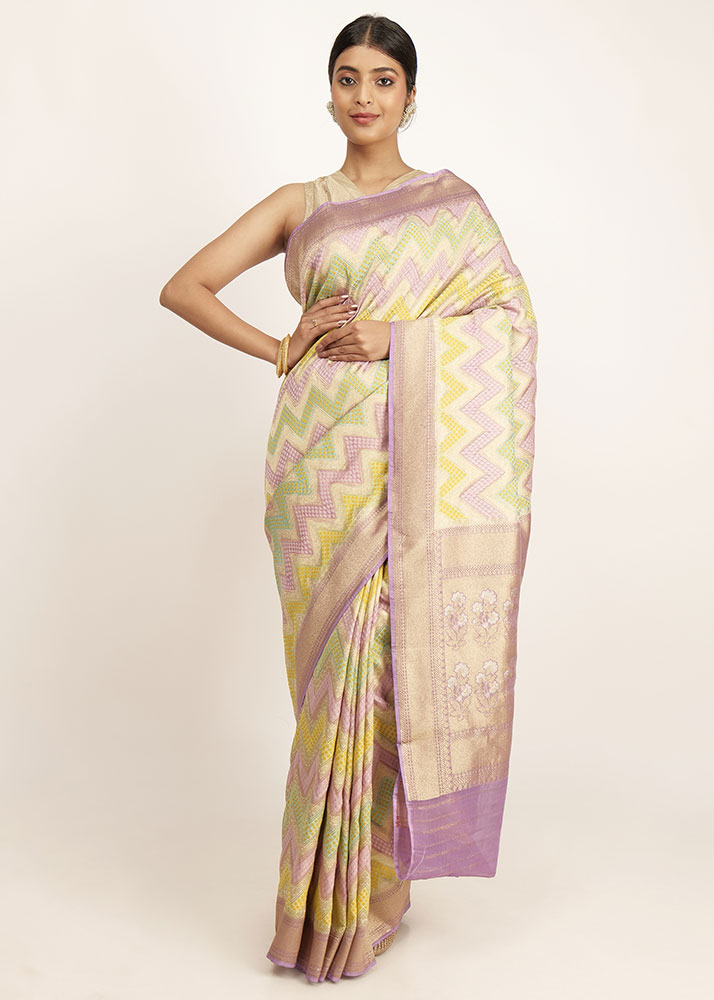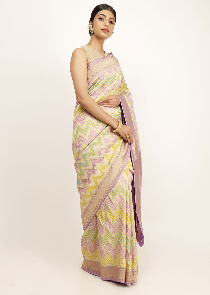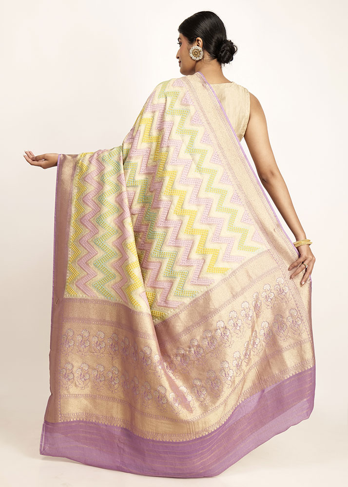 It is a stunning pastel rangkaat banarasi in mauve,yellow, sea green and lilac. The floral palla and zari border makes it an enchanting piece.