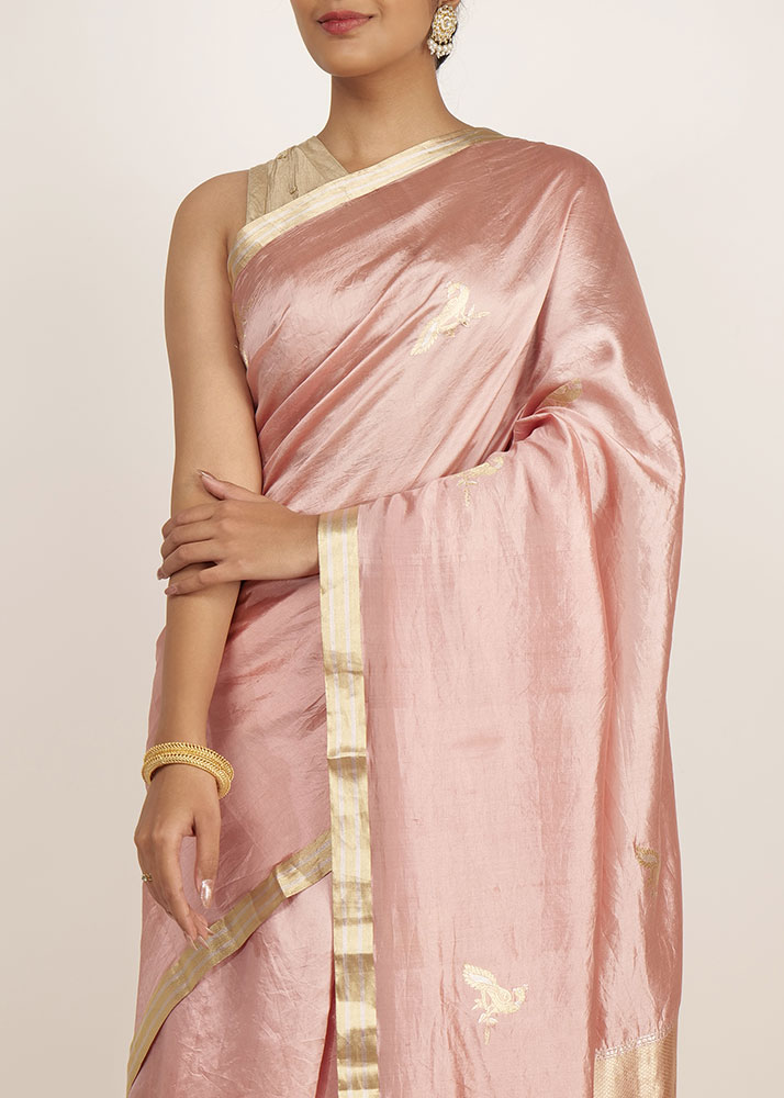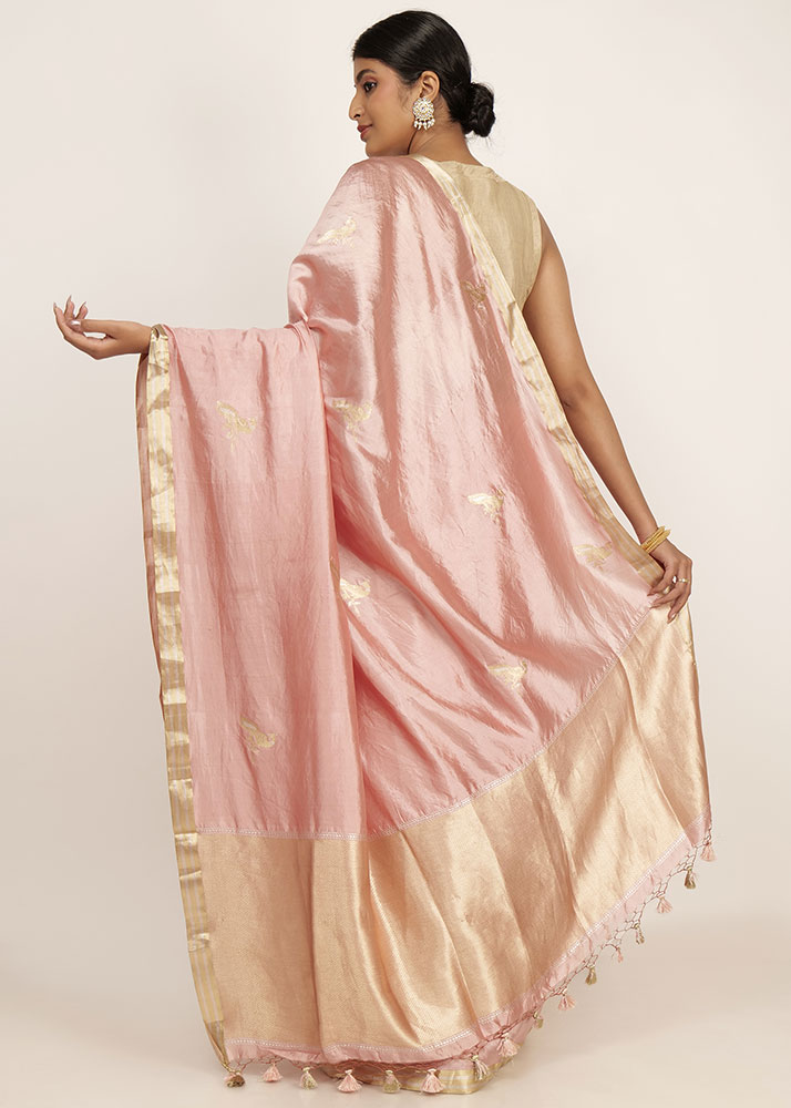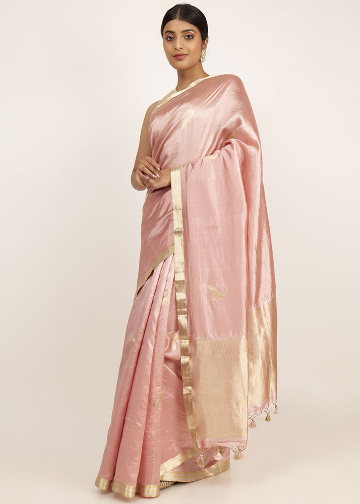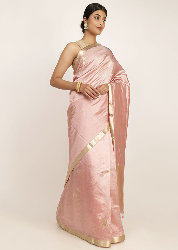 Made on pure katan silk, this authentic saree has bird booti and zari pallu. It can be a perfect gift for any woman.