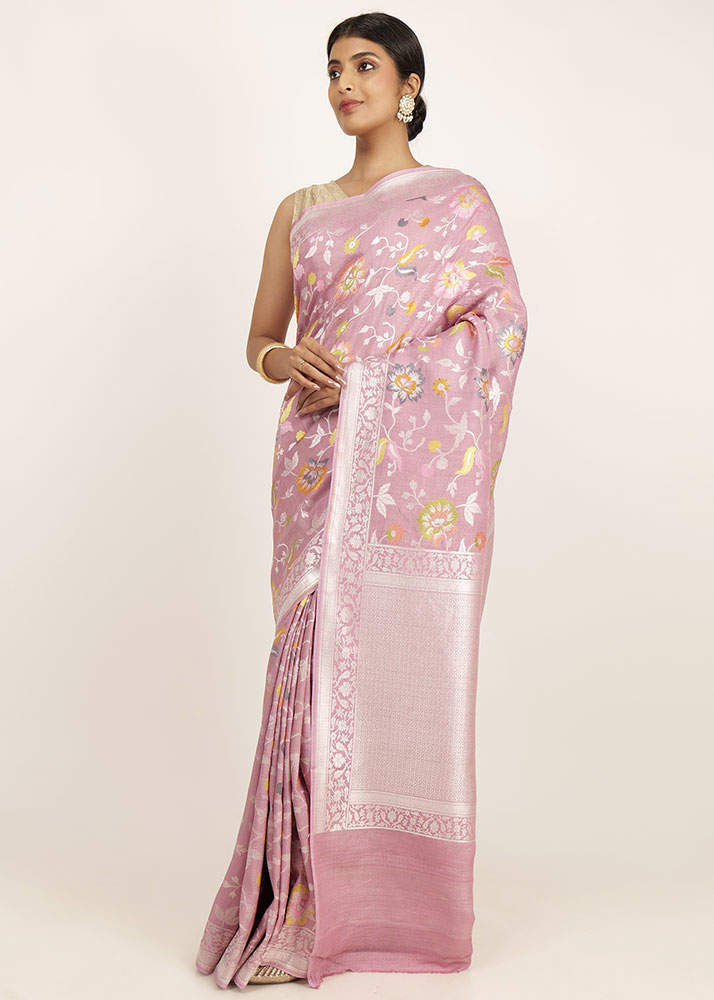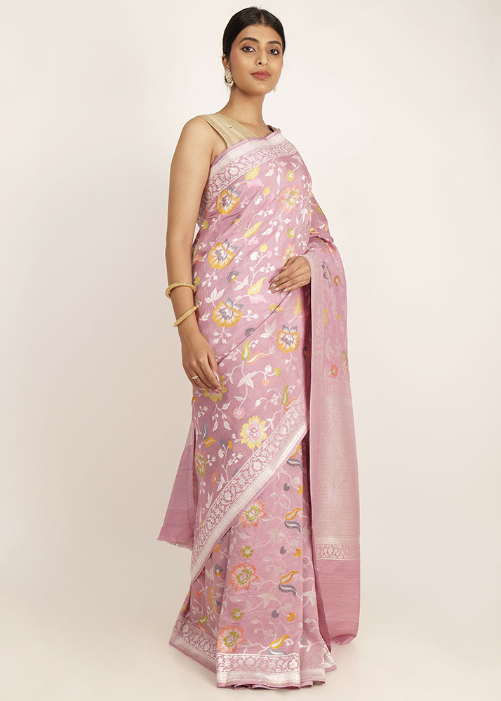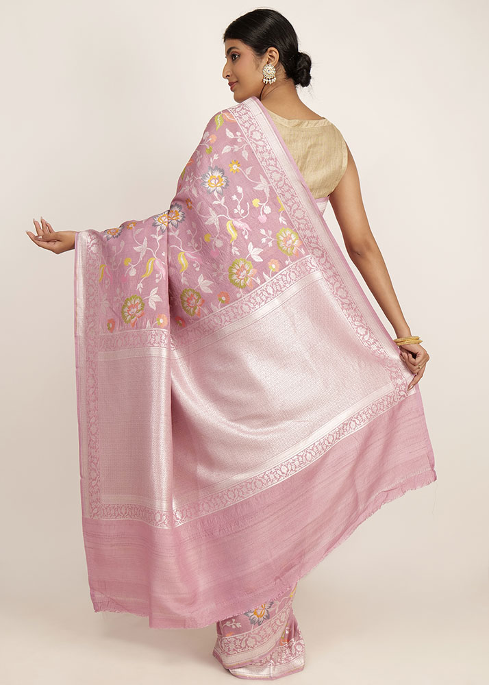Pure Tusser Banarasi Tilfii saree in onion pink colour, made by the hands of a dedicated artisan with skill passed down through generation.