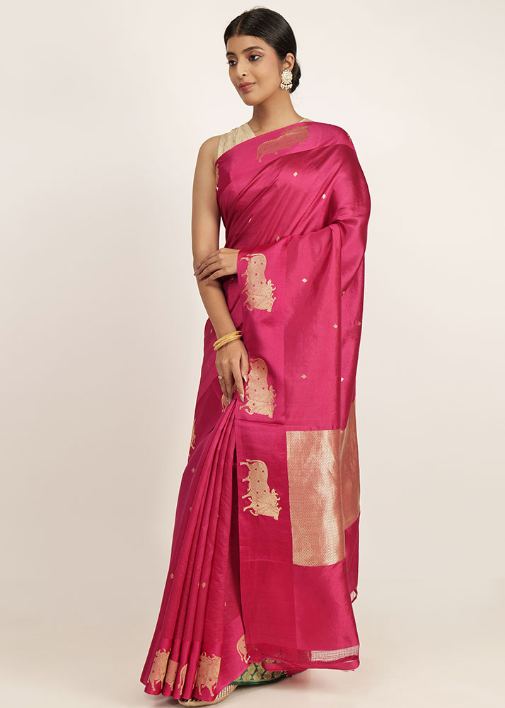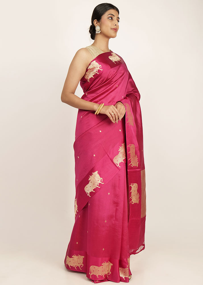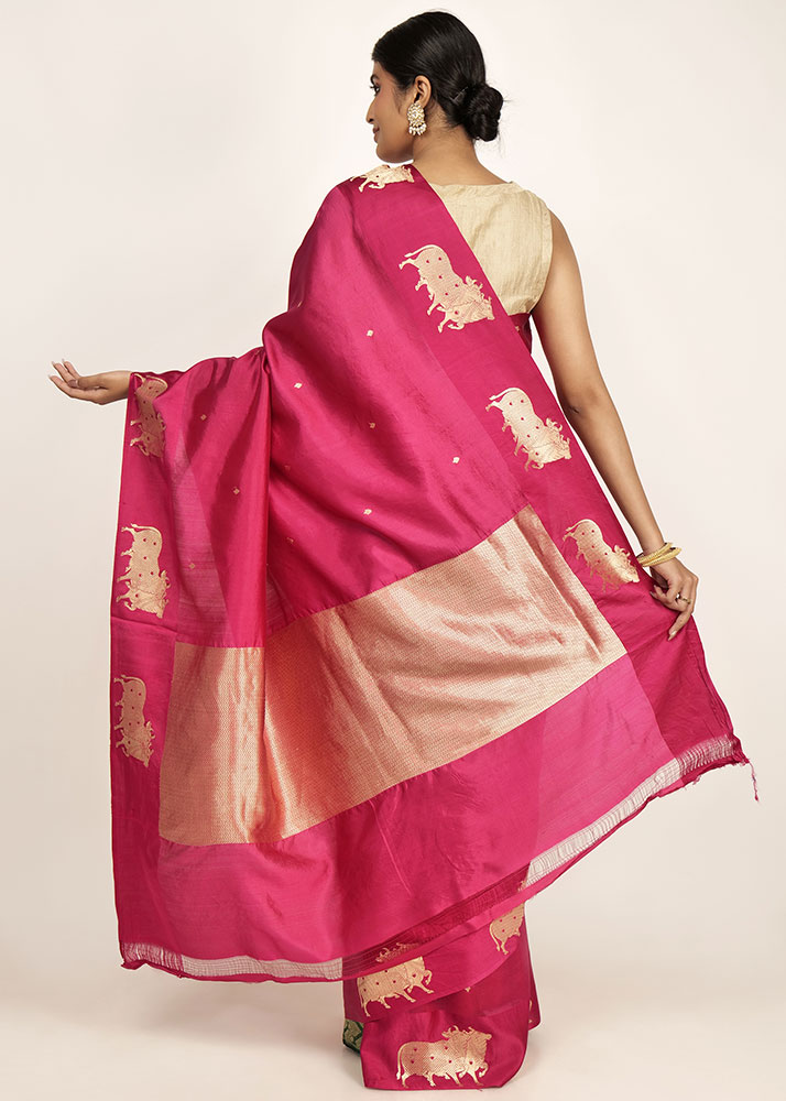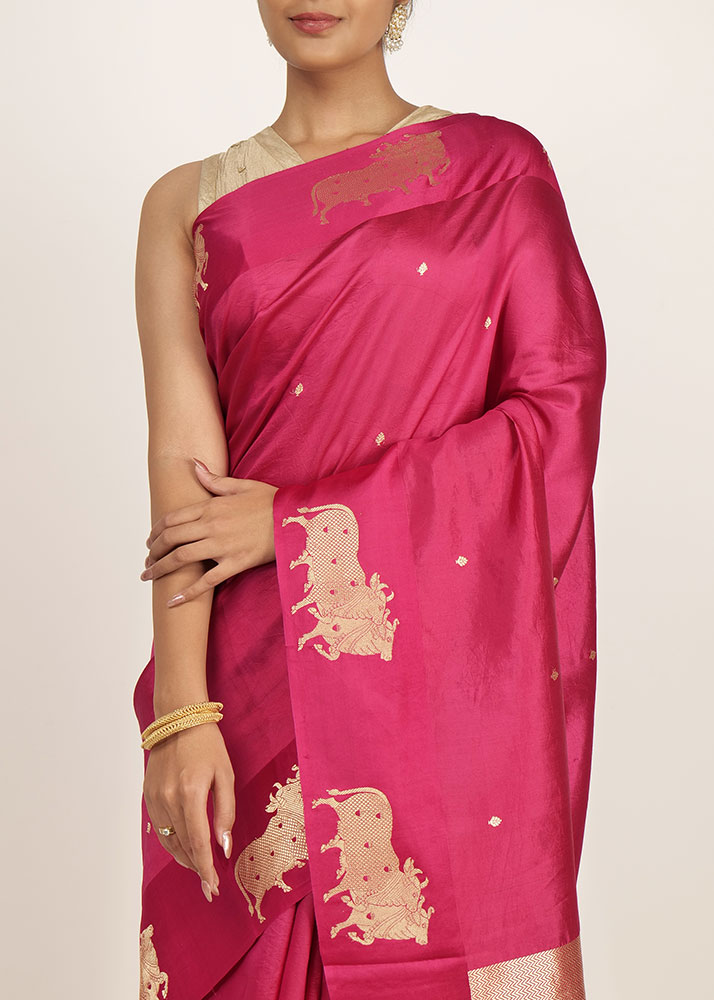 Fascinating burgundy colour pure silk saree with cow motifs in zari on border and gold zari on pallu is a treasure. Pure mushroo silk looks magnificent.