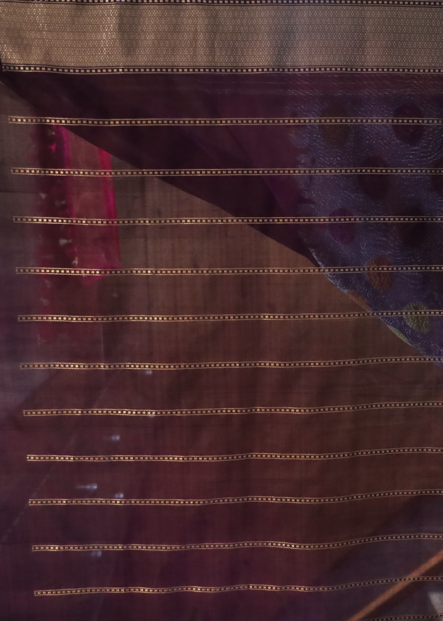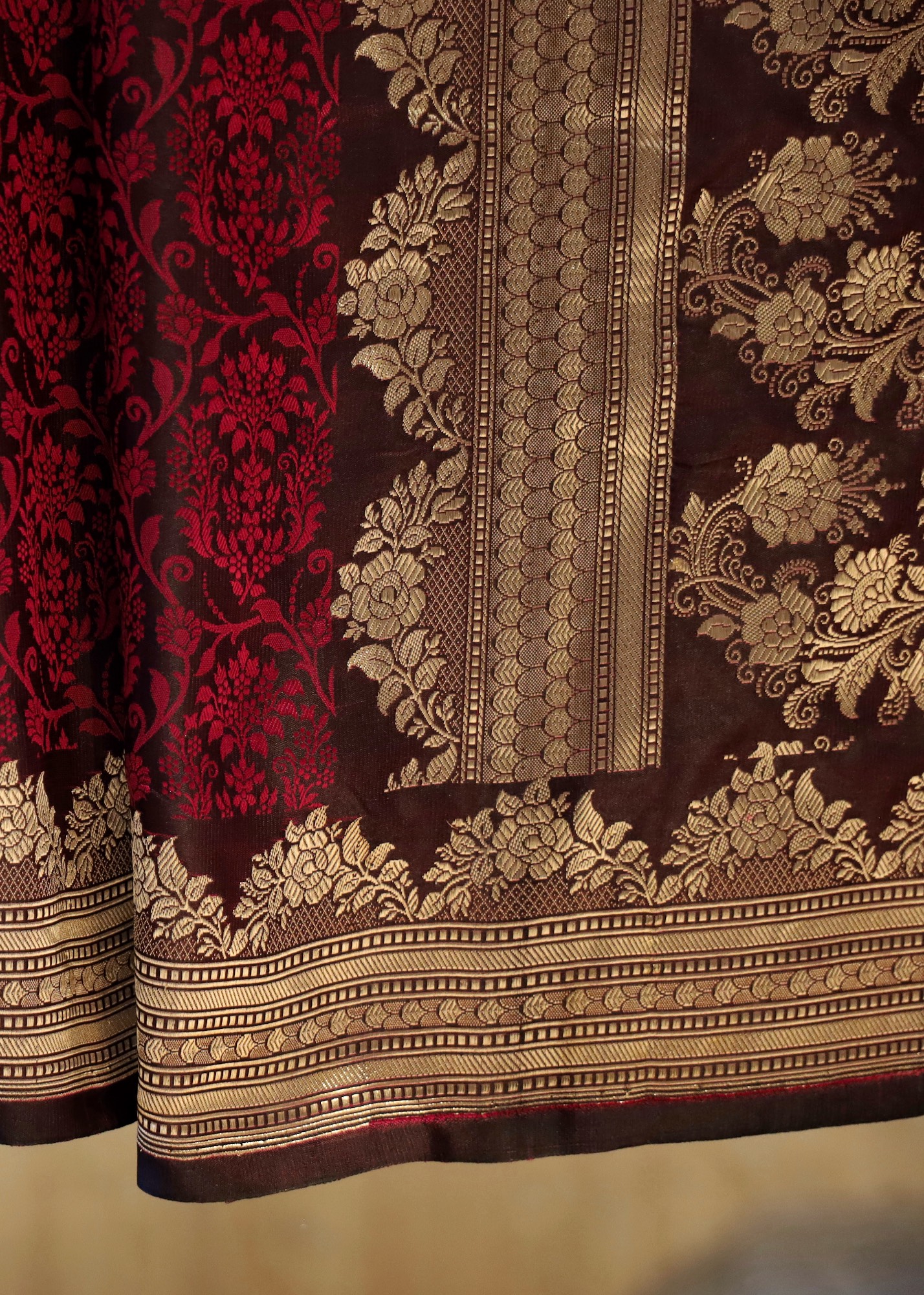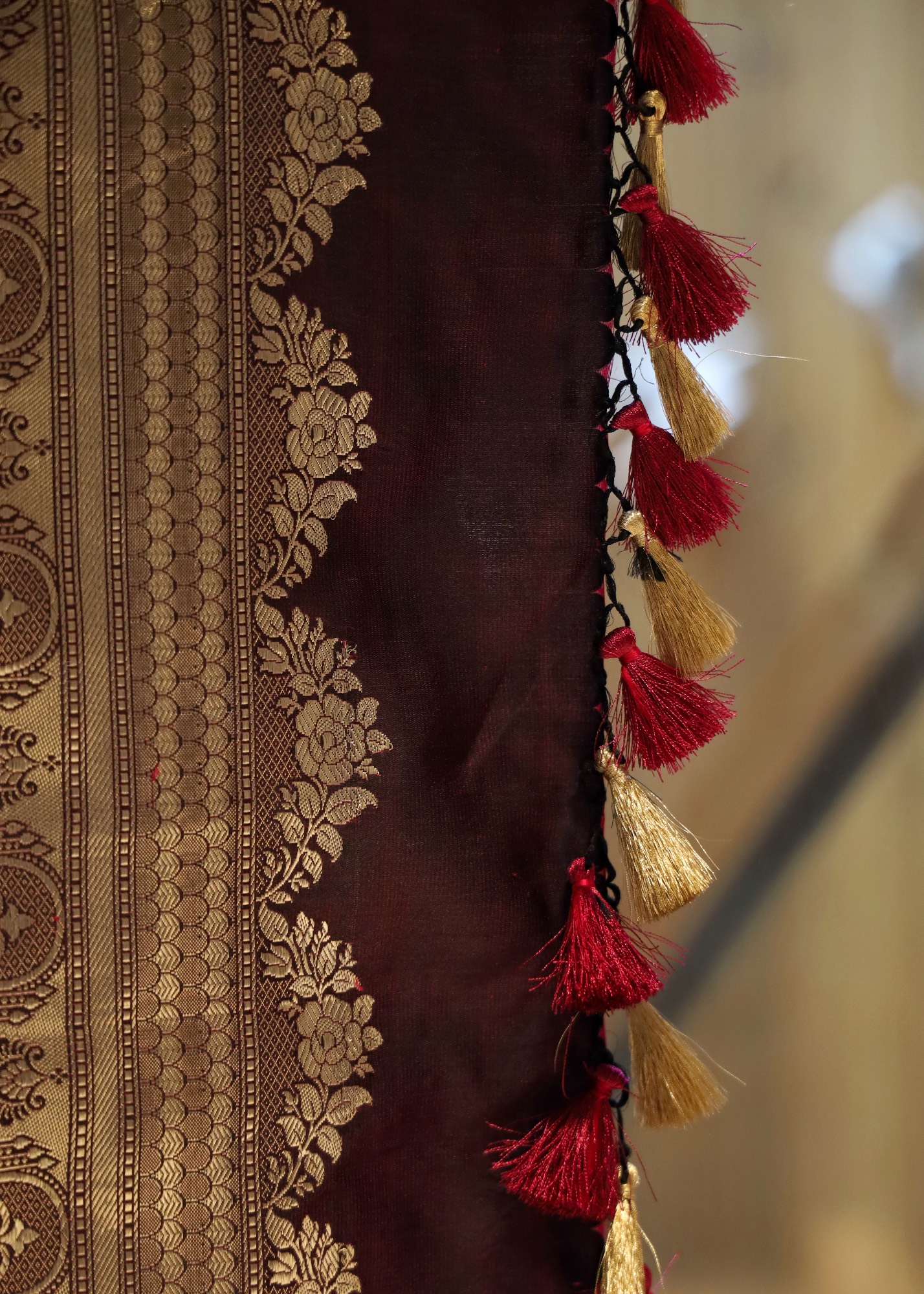 The pink Tanchoi weaving on Mashroo fabric adds a delicate and intricate touch to the saree. Tanchoi is a weaving technique known for its elaborate motifs and patterns, featuring floral designs or intricate geometric shapes. The pink color complements the wine base beautifully, adding a subtle pop of contrast and femininity.Mashroo fabric, with its soft texture and luxurious feel, drapes gracefully, enhancing the saree's silhouette and ensuring comfort throughout the day or evening. Its subtle sheen adds a touch of glamour, making the saree suitable for both formal occasions and more intimate gatherings.