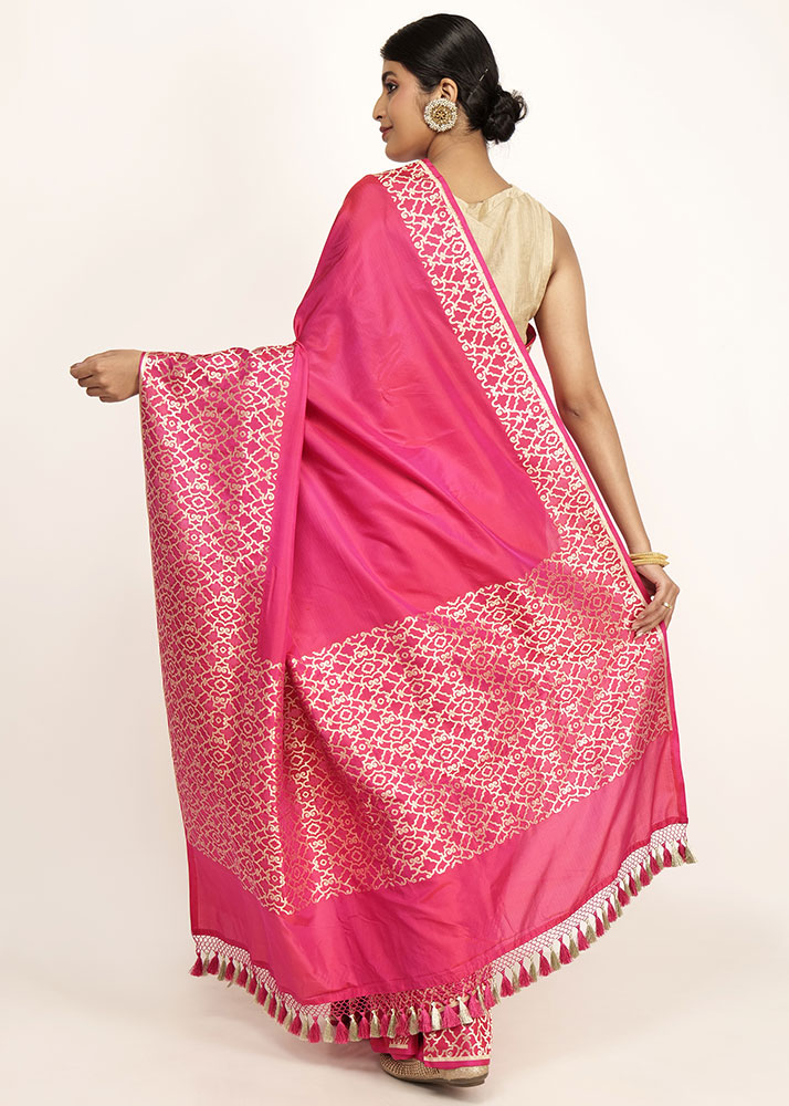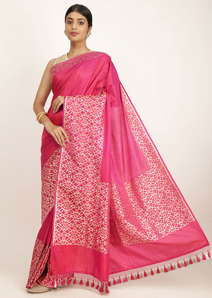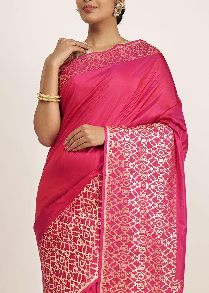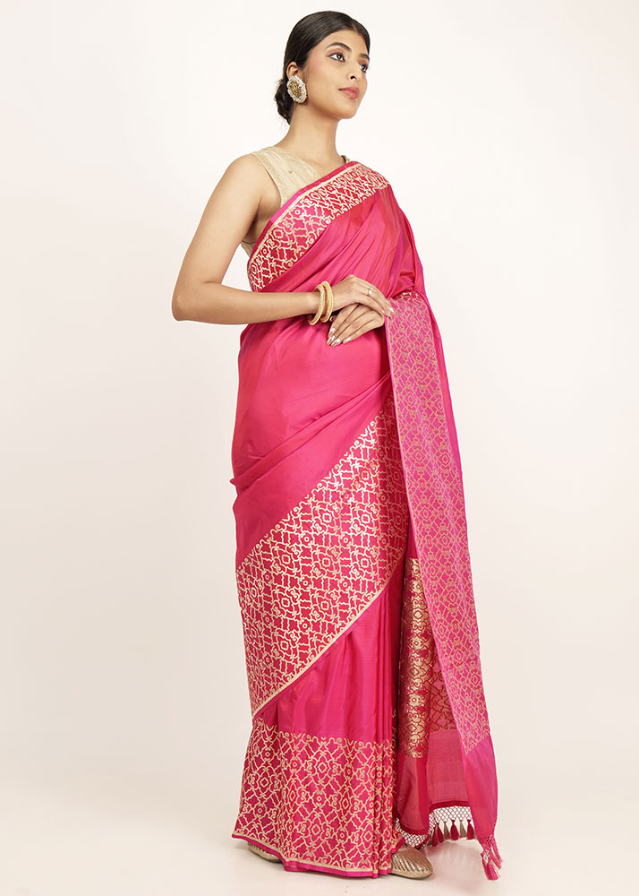 Pink colour with the robust zari pattern stands out on the fabric. Perfect for any occasion.