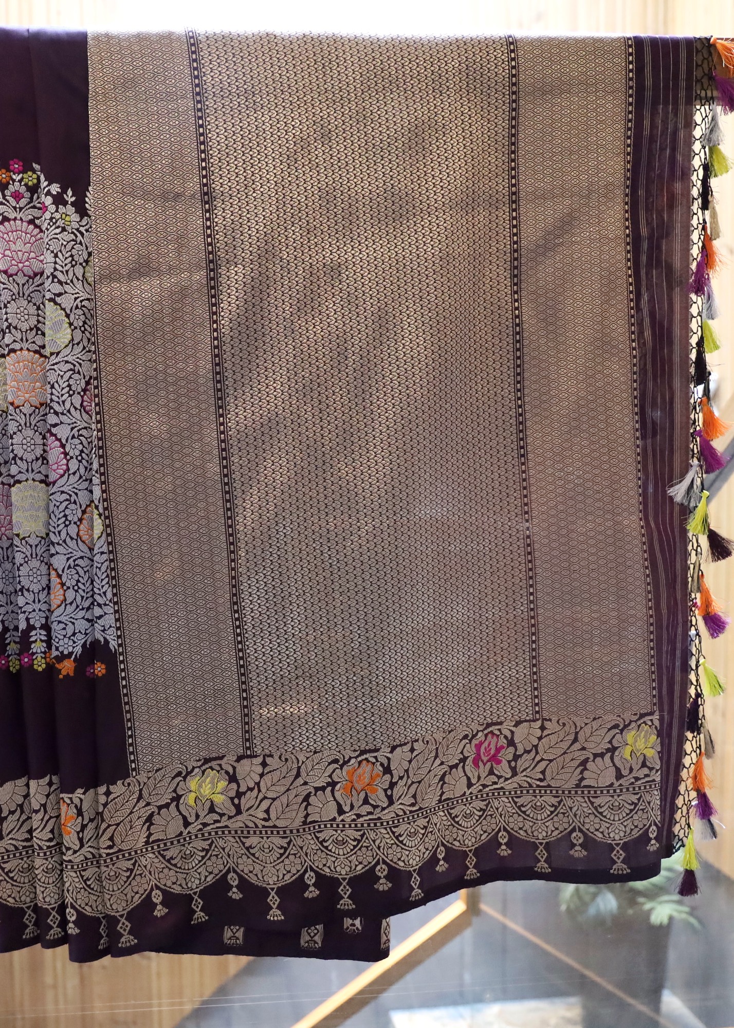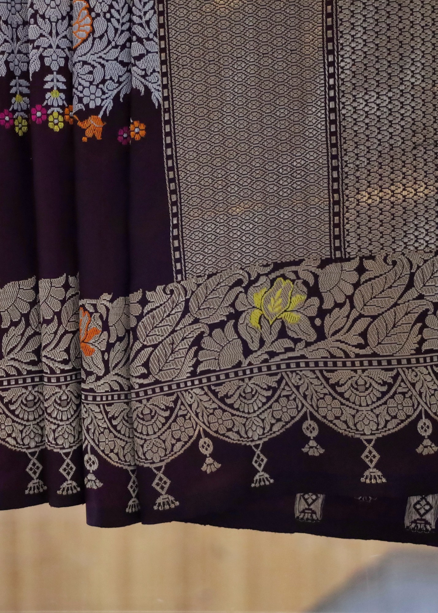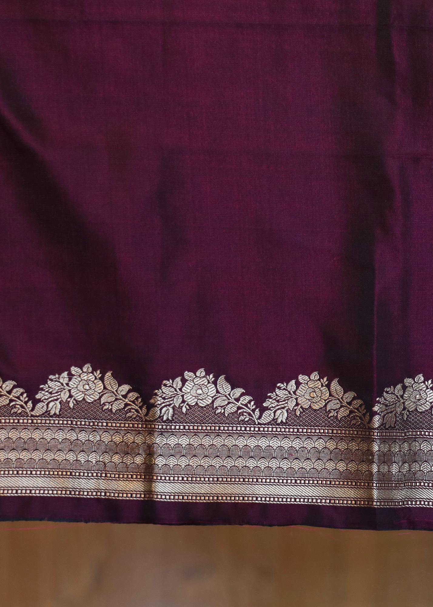 The Kadhwa weave in the middle of the saree elevates its beauty to new heights. Kadhwa weaving involves the intricate hand-weaving of metallic threads to create elaborate floral motifs and patterns. In the middle of the saree, this weaving technique forms a focal point of exquisite craftsmanship.Crafted from pure Banarasi katan silk, the saree drapes luxuriously, enveloping the wearer in its smooth texture and lustrous sheen. Banarasi silk is renowned for its quality and craftsmanship, making it a cherished heirloom piece that can be passed down through generations.