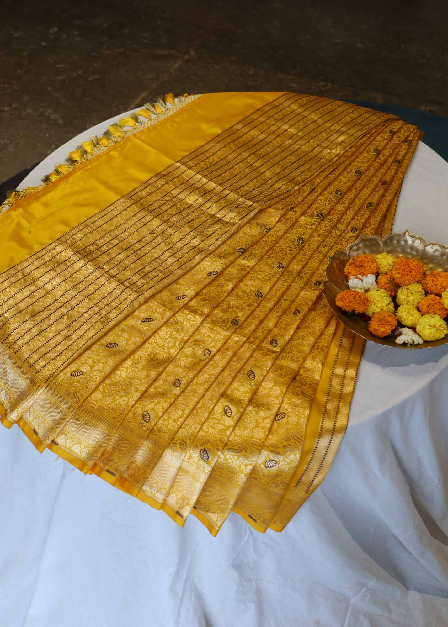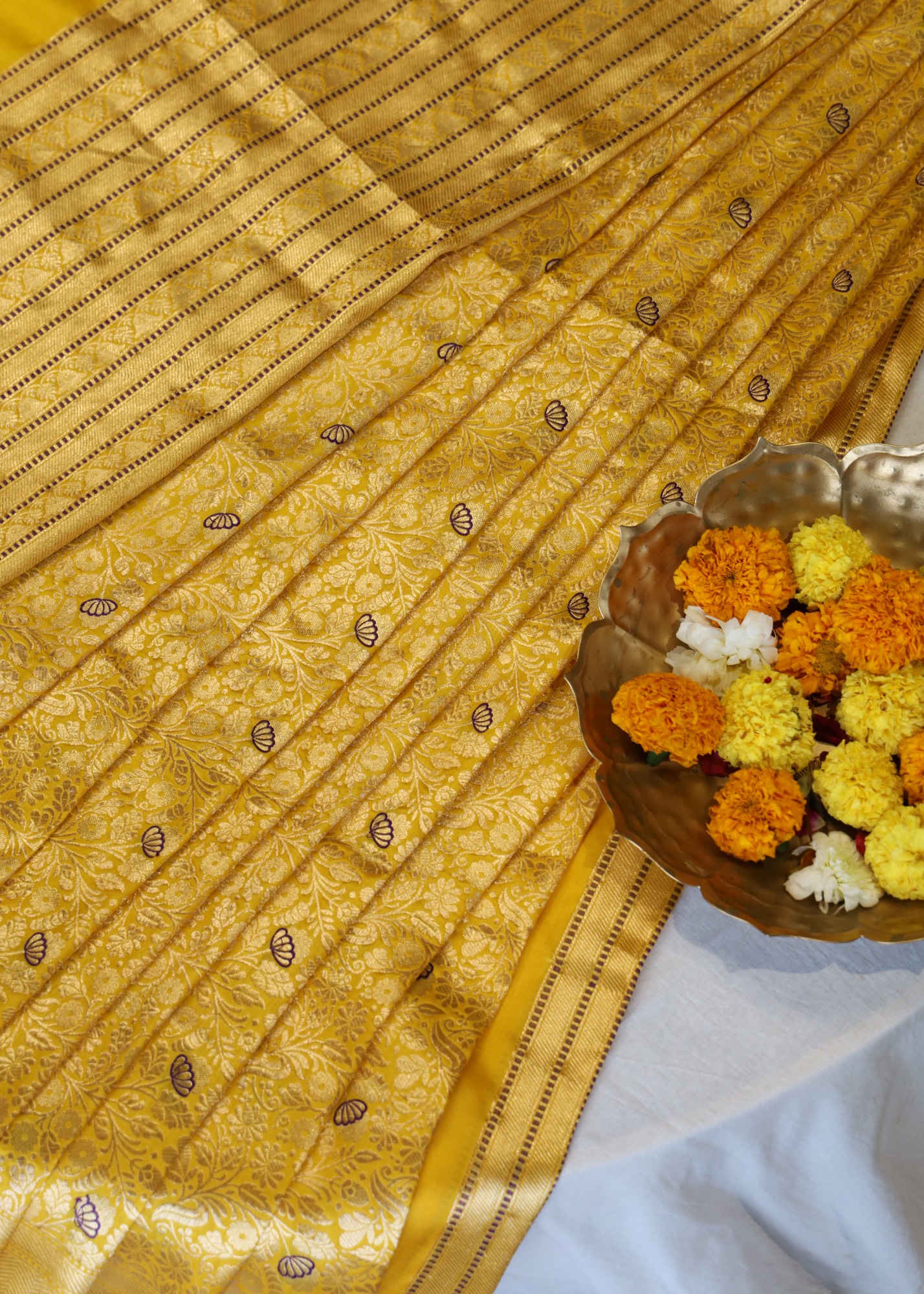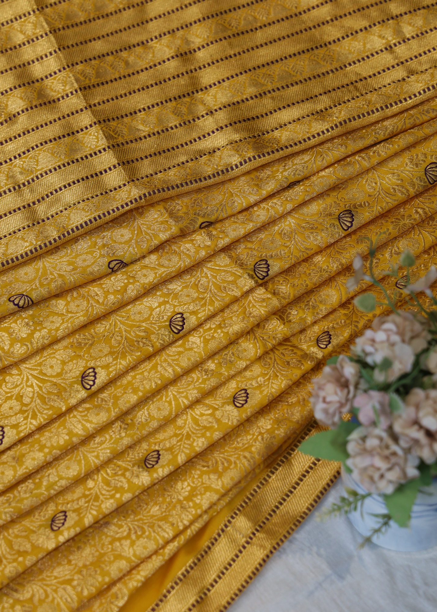 The saree is adorned with intricate brocade work, showcasing exquisite floral patterns that reflect the rich heritage of Indian weaving. Interspersed within the brocade are delicate blue minakari, adding a striking contrast to the bright yellow background. The blue mina accents elevate the saree’s elegance, creating a captivating visual effect that is both vibrant and sophisticated.