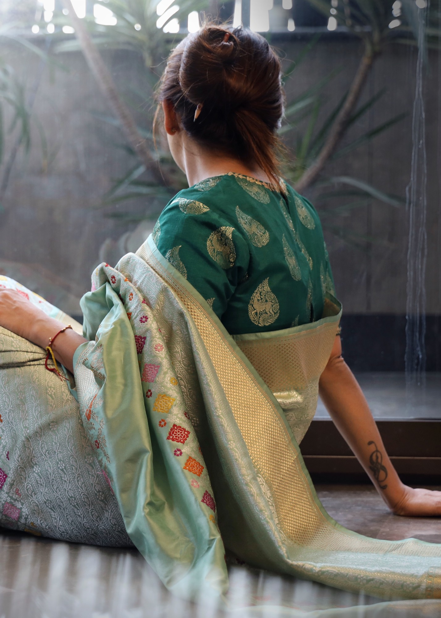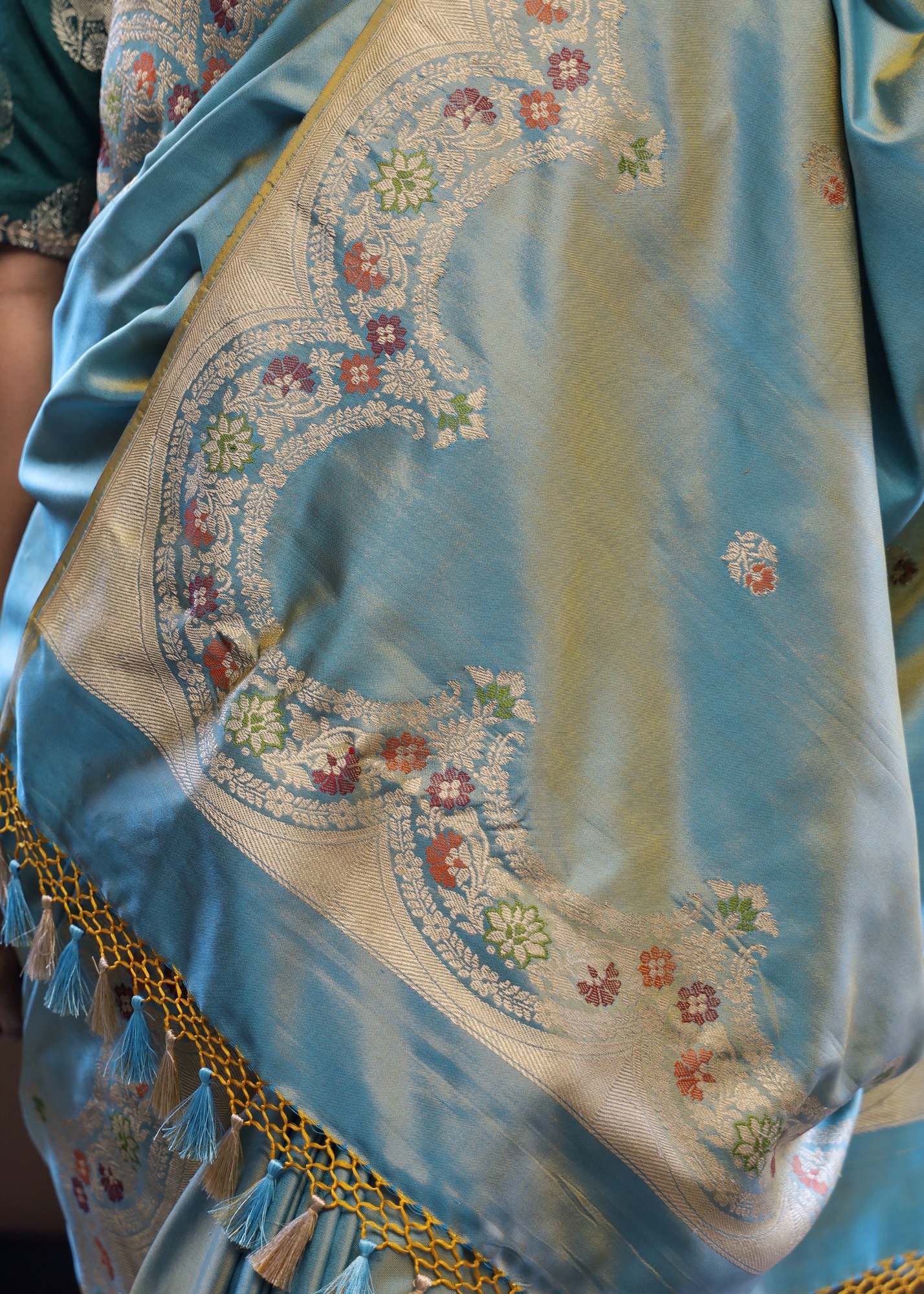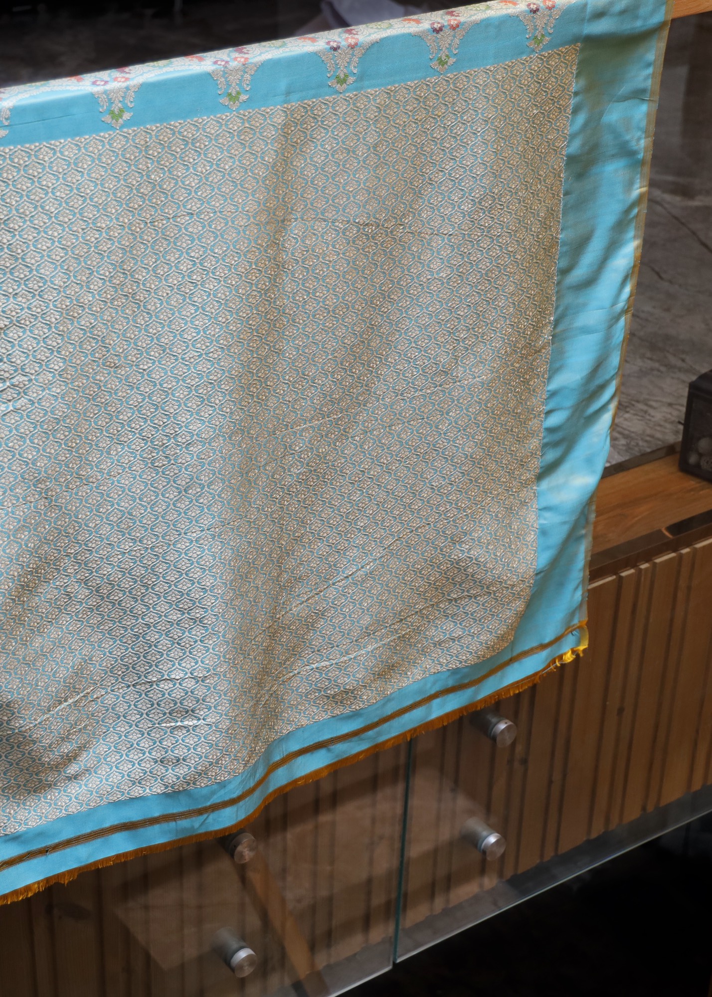 - Don’t store the saree in a plastic cover as this will cause the gold embroidery to turn black.