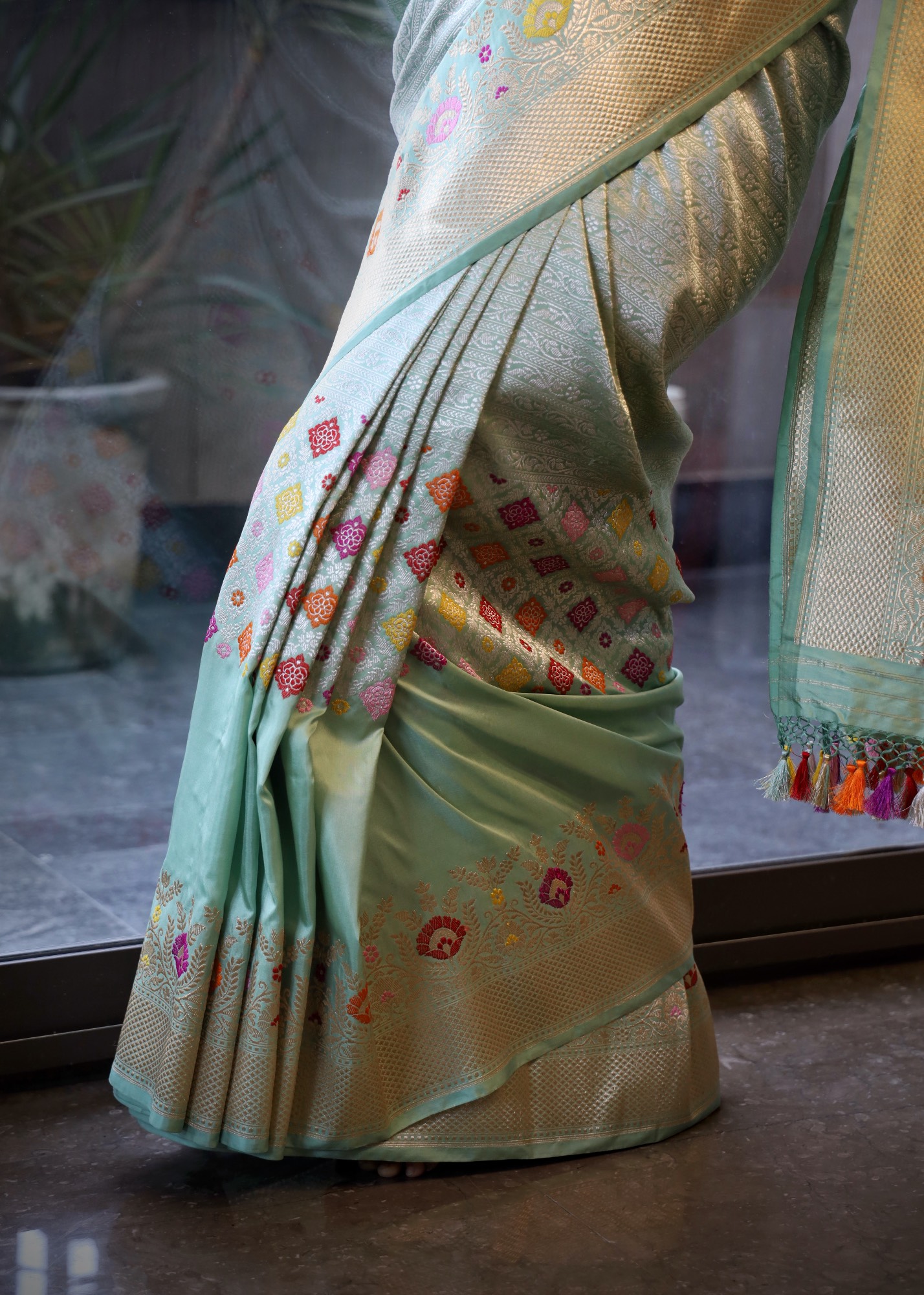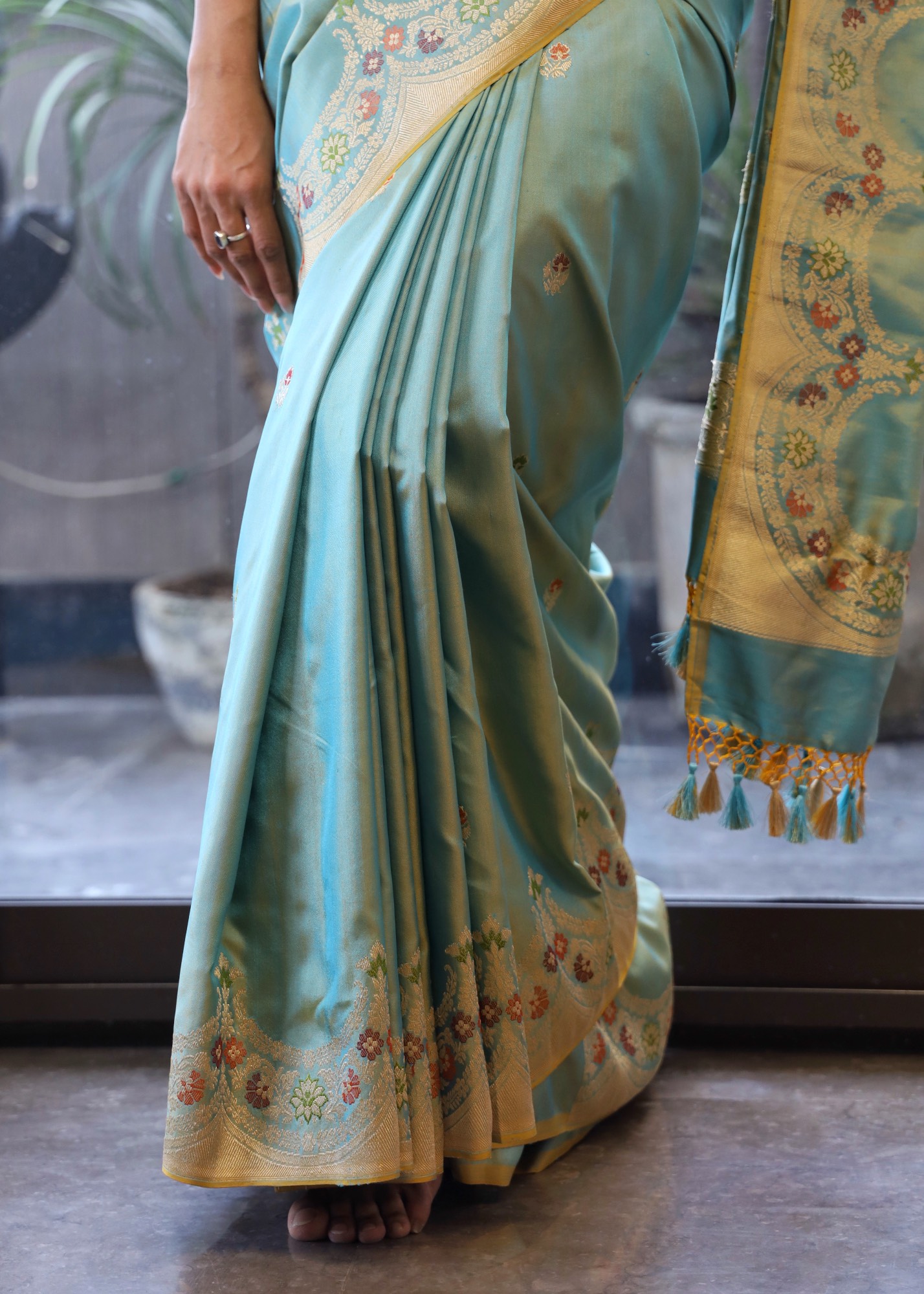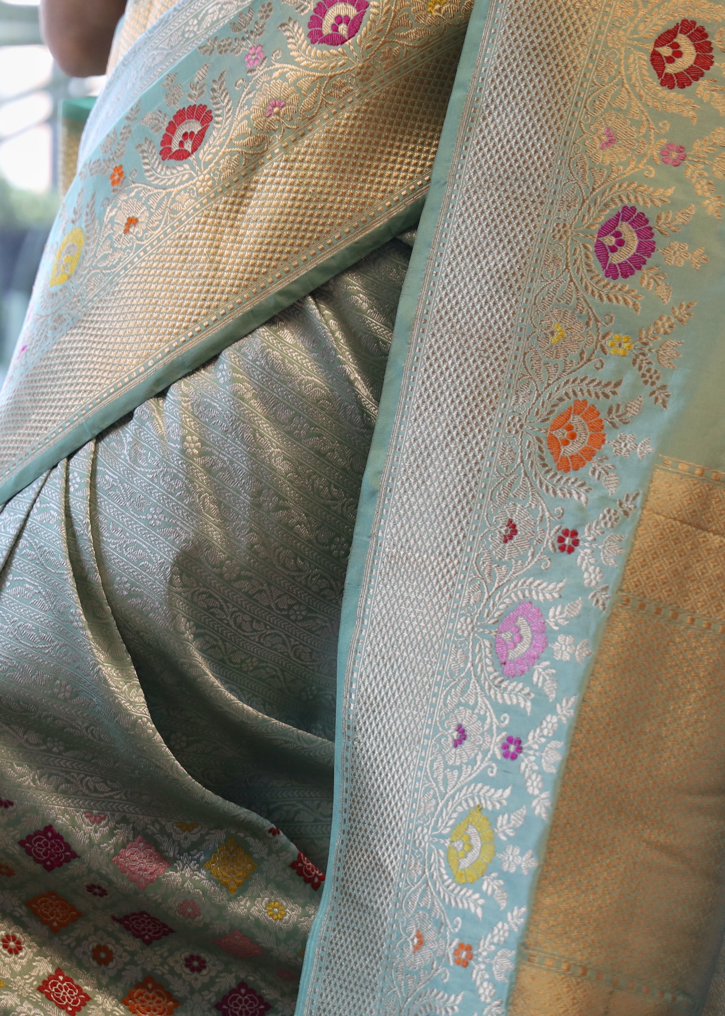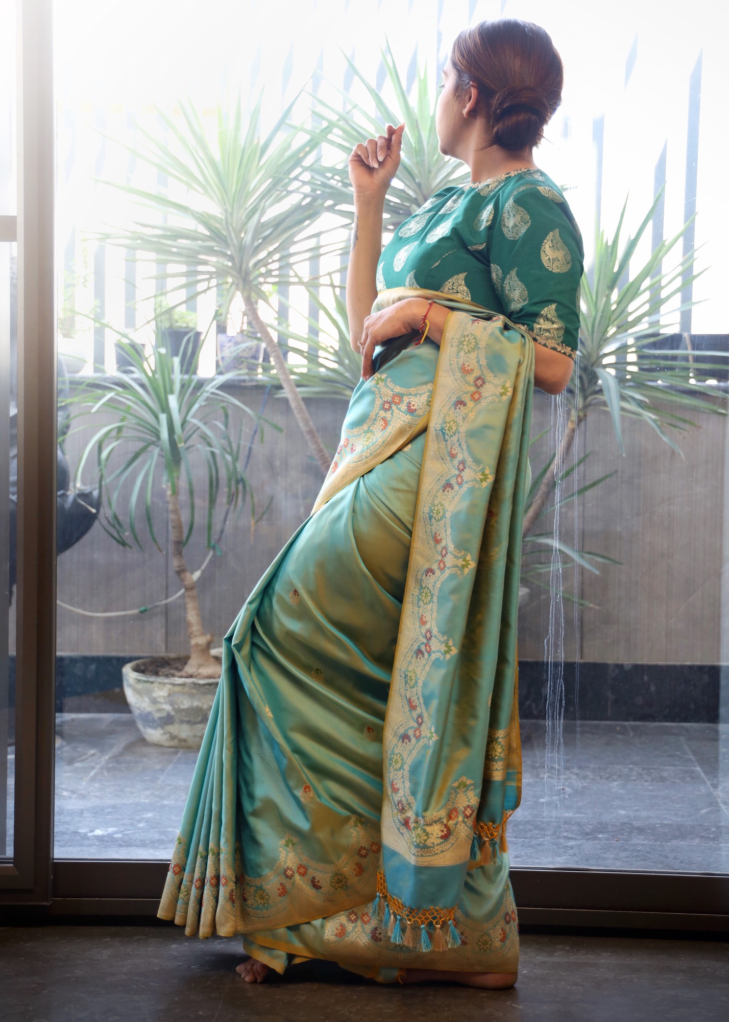 - Don’t store the saree in a plastic cover as this will cause the gold embroidery to turn black.