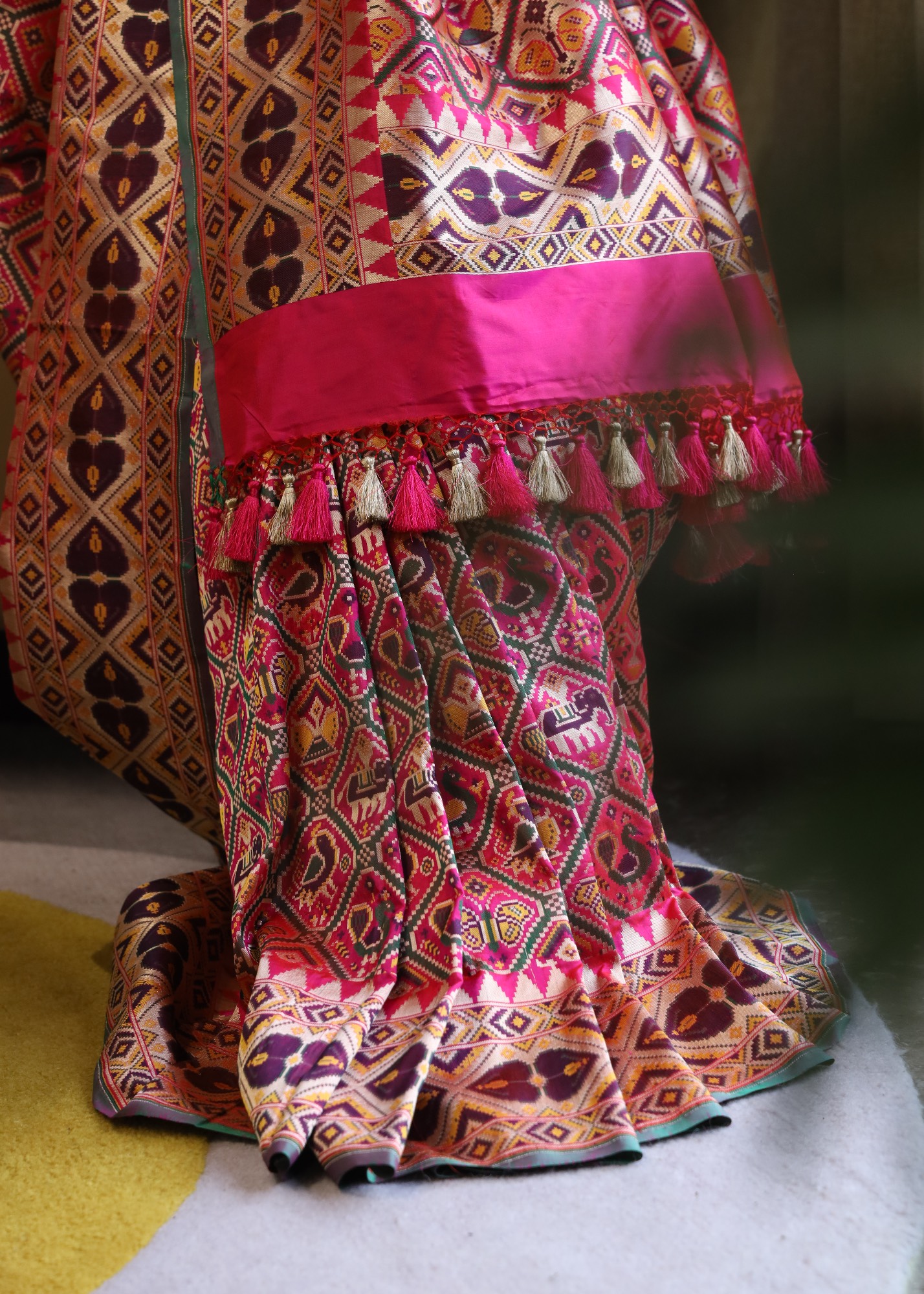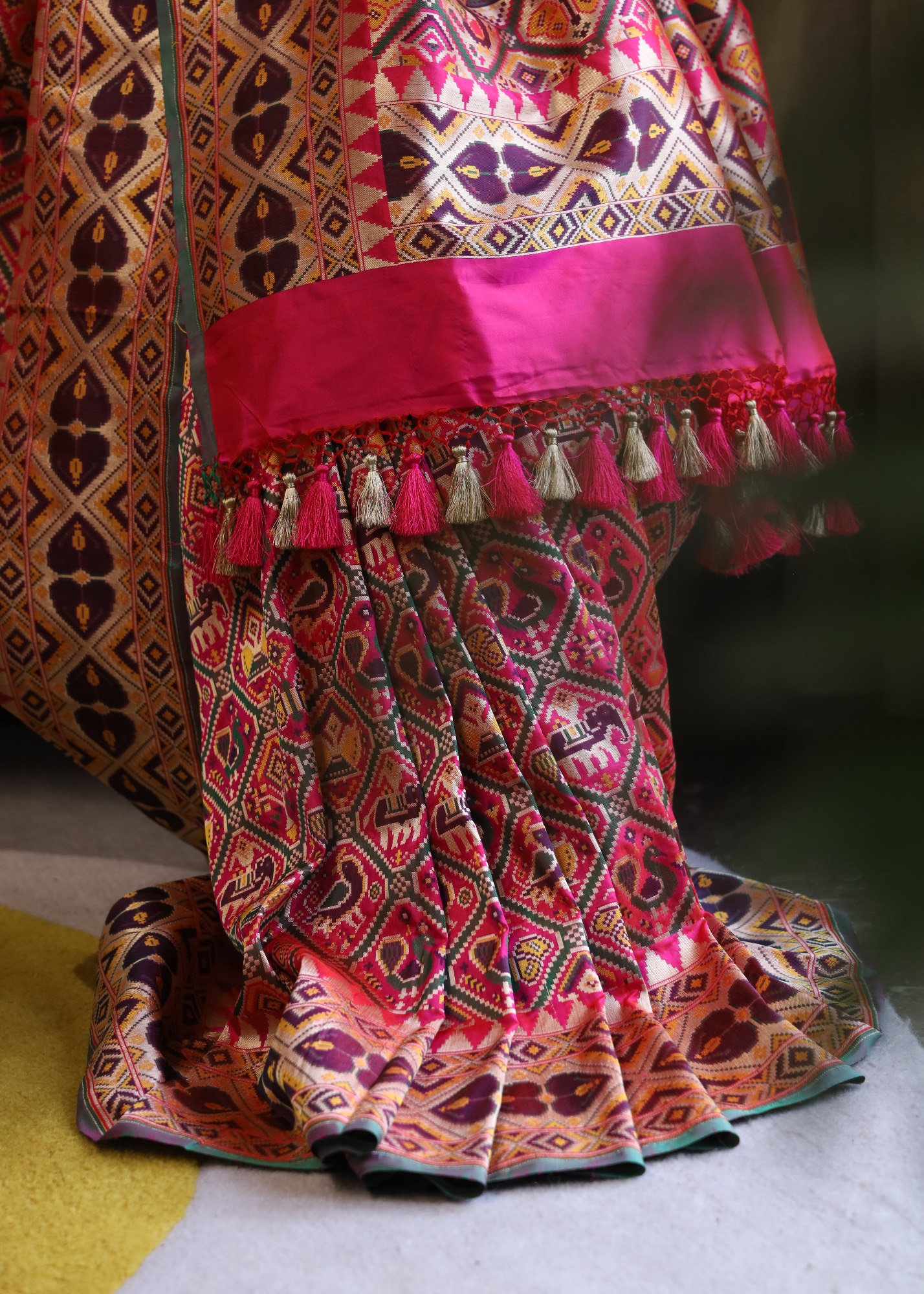 The Pink Pure Katan Patola Saree is a stunning embodiment of elegance and tradition. Adorning the saree are intricately woven motifs featuring majestic elephants and graceful birds, symbolizing beauty, strength, and freedom. The rich and vibrant colors of the motifs contrast beautifully against the bright pink background, creating a captivating visual appeal. Perfect for special occasions and celebrations, this saree is a timeless masterpiece that effortlessly combines tradition with contemporary style.