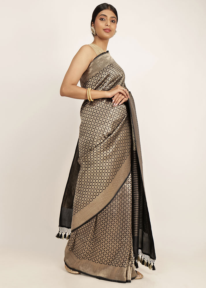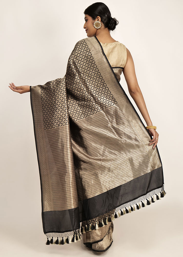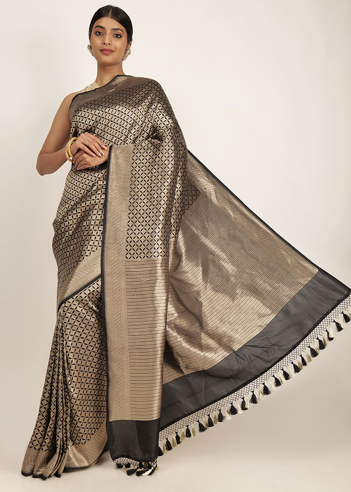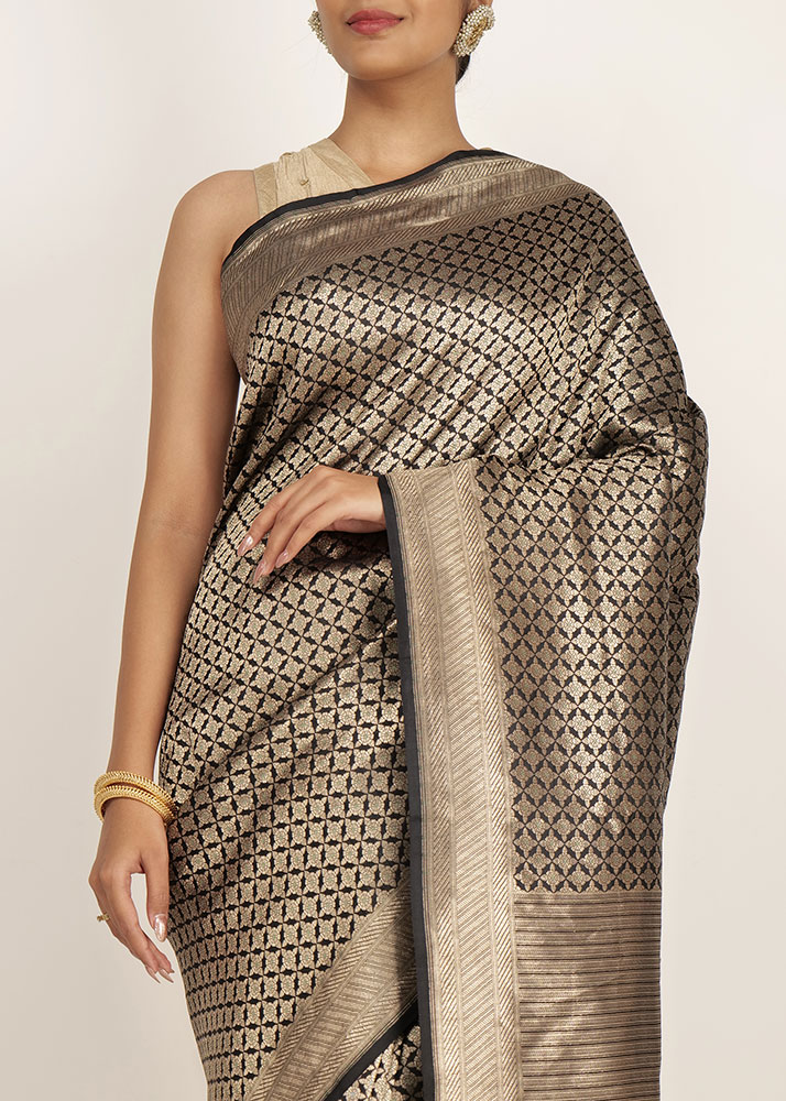 Black handloom pure katan silk saree with gold minakari booti all over. it is a 'Gali Banaras' favourite. This grand saree is perfect for a grand occasion.