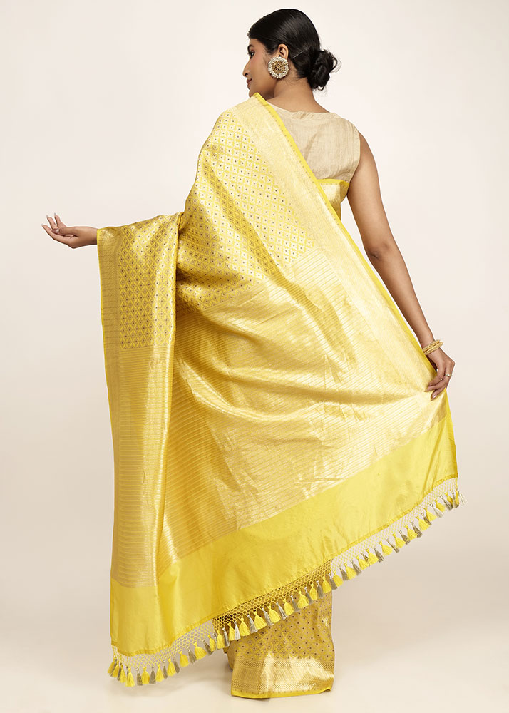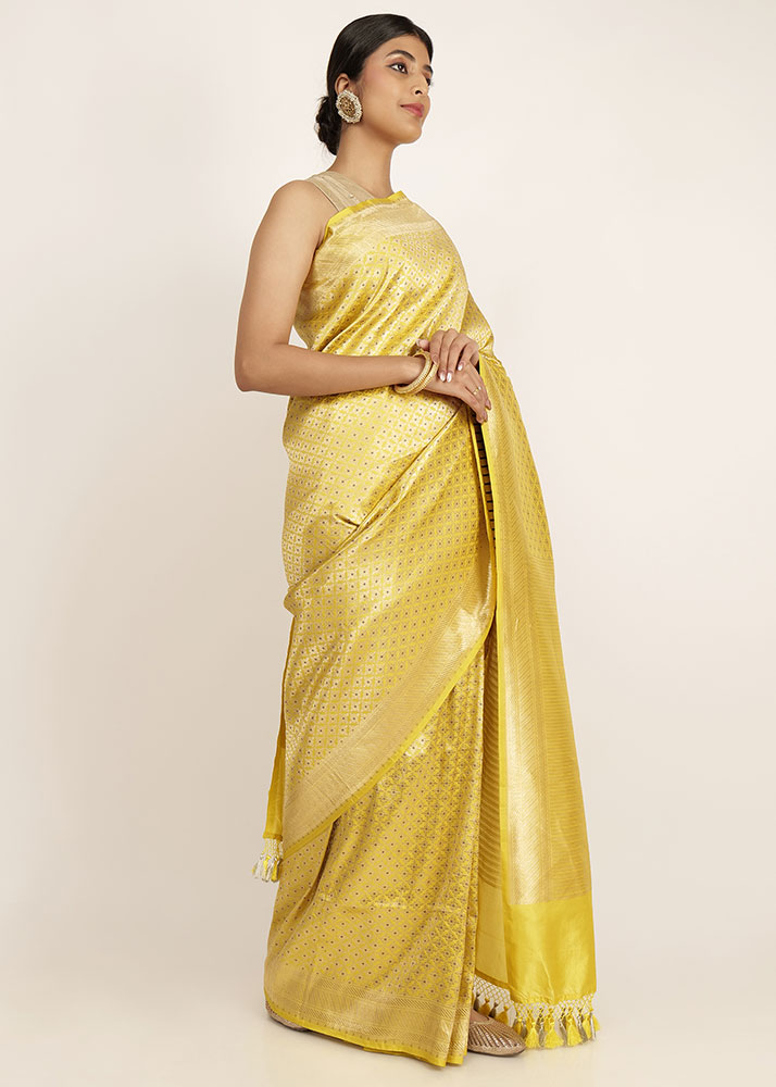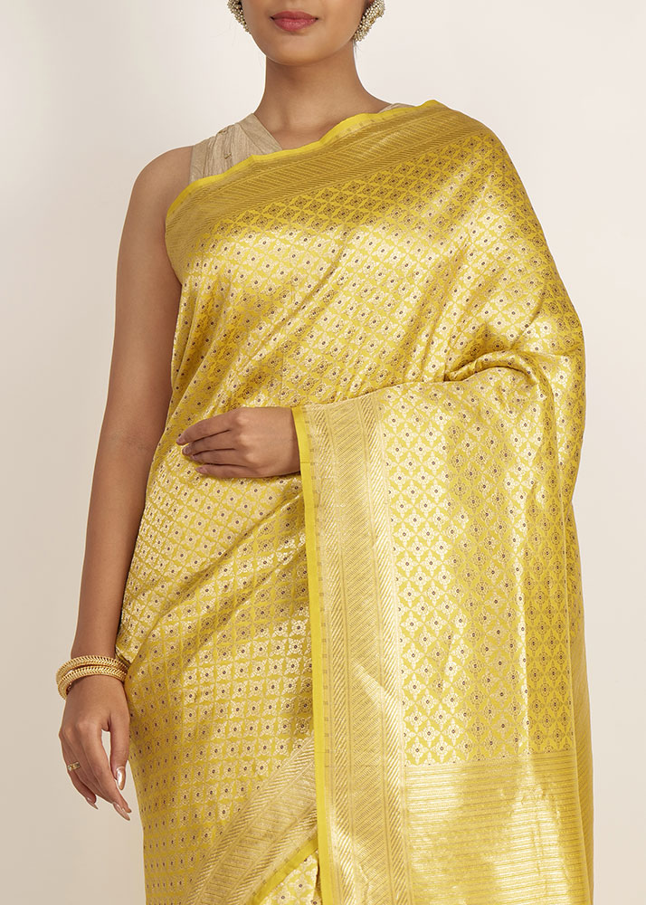 It is one of its kind yellow pure katan silk with most exquisite gold zari with minakari work on it. Look like a blossoming flower on every festival.